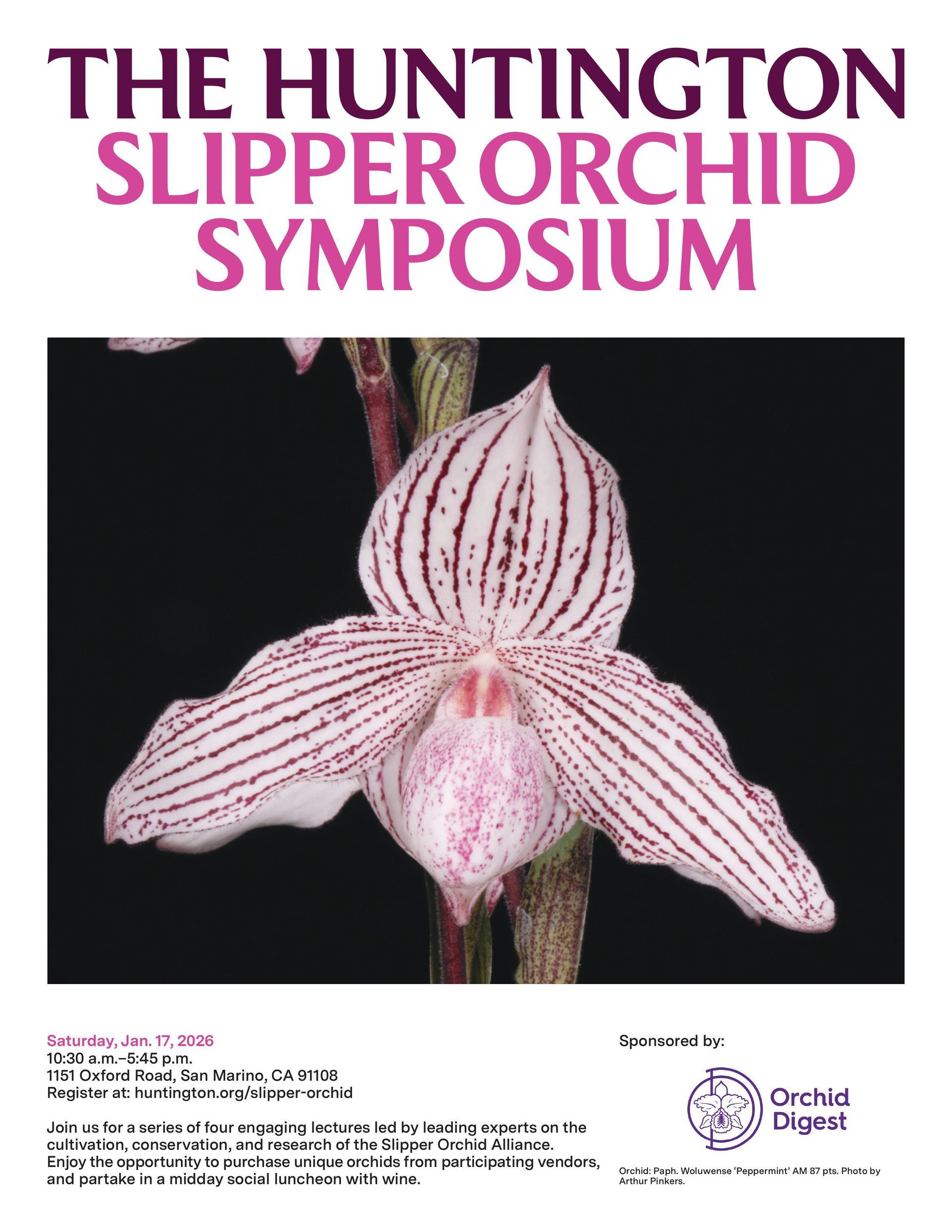 Set amid the breathtaking botanical gardens of The Huntington, this symposium will feature expert speakers, cutting-edge presentations, and special slipper orchids celebrating the remarkable diversity of slipper orchids (Paphiopedilum, Phragmipedium, Cypripedium, and more), as well as slipper orchid culture.